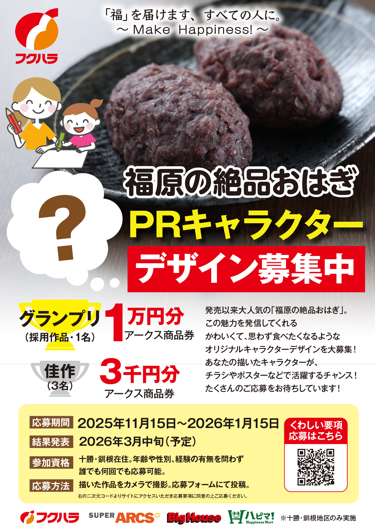 - 作品の利用について: グランプリに選ばれた作品は、「福原の絶品おはぎ」のPR活動(チラシ、店内ポスター、POP、Webサイト、SNSなど)に使用します。